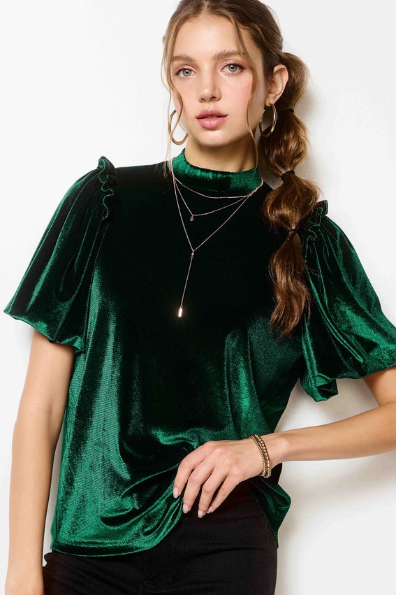Velvety short sleeve top in a flattering fit featured in a puff sleeve, mock neck collar. Made with stretchy fabric with two buttons on the back for an easy wear. Adorable to pair with jeans or skirts for a gorgeous look for a holiday party.