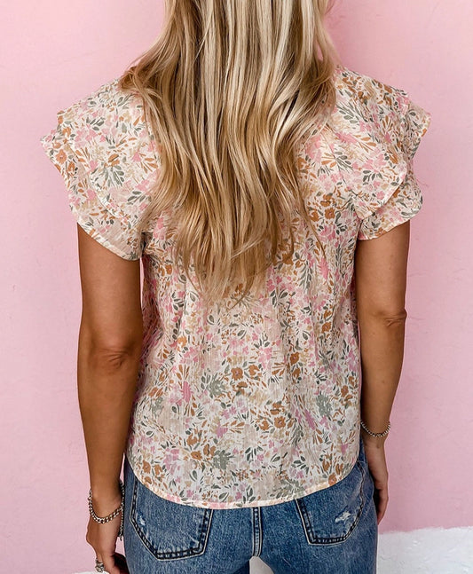 V Neck Trim Rolled Short Sleeve Blouse Top